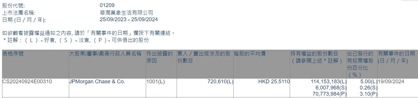 智通财经APP获悉,香港联交所最新资料显示,9月19日,小摩增持华润万象生活(01209)72.061万股,每股作价25.511港元,总金额约为1838.35万港元。增持后最新持股数目约为1.14亿股,最新持股比例为5.00%。