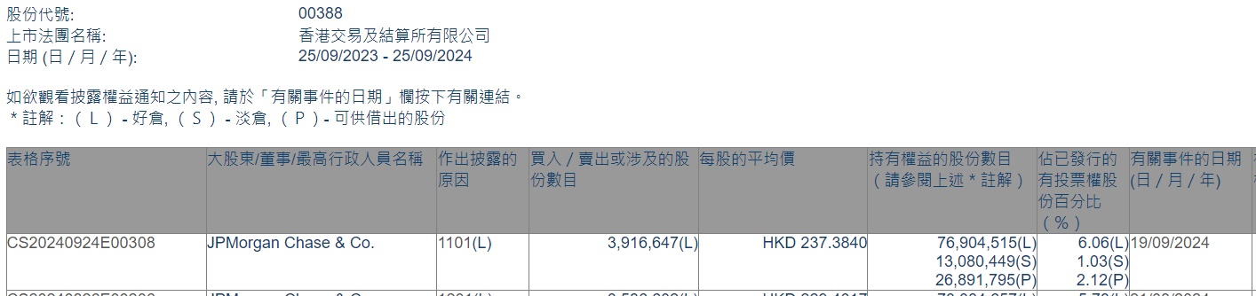 智通财经APP获悉,香港联交所最新资料显示,9月19日,小摩增持港交所(00388)391.6647万股,每股作价237.3840港元,总金额约为9.3亿港元。增持后最新持股数目约为7690.45万股,最新持股比例为6.06%。