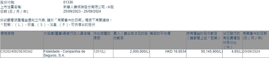 智通财经APP获悉,香港联交所最新资料显示,9月20日,Fidelidade - Companhia de Seguros, S.A.减持新华保险(01336)200万股,每股作价16.8034港元,总金额为3360.68万港元。减持后最新持股数目为5014.59万股,最新持股比例为4.85%。