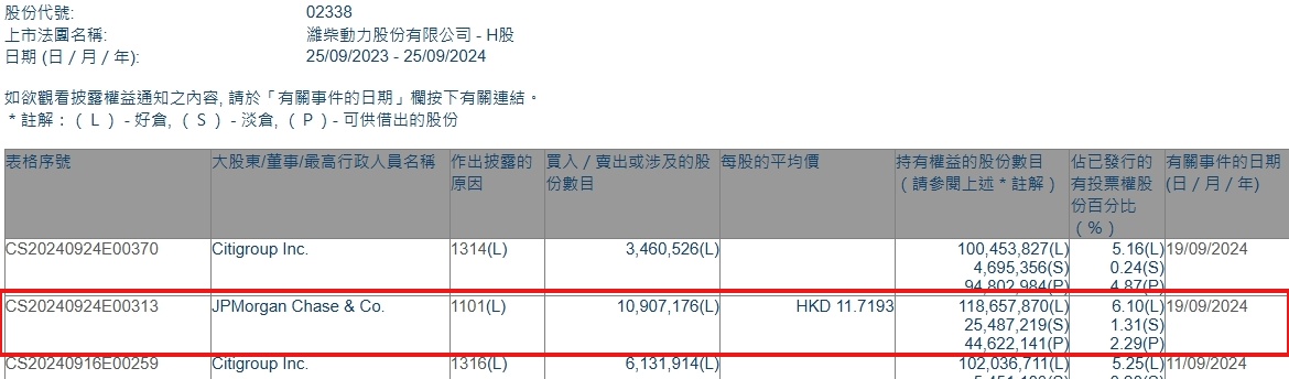 智通财经APP获悉,香港联交所最新资料显示,9月19日,摩根大通增持潍柴动力(02338)1090.7176万股,每股作价11.7193港元,总金额约为1.28亿港元。增持后最新持股数目约为1.19亿股,最新持股比例为6.1%。