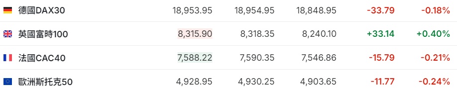 2. 截至发稿,德国DAX指数跌0.18%,英国富时100指数涨0.40%,法国CAC40指数跌0.21%,欧洲斯托克50指数跌0.24%。