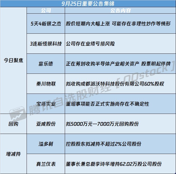 银之杰发布股票交易异常波动暨严重异常波动公告,公司股价短期内大幅上涨,可能存在非理性炒作等情形;近期股票换手率及成交量明显放大,可能存在股价大幅上涨后回落的风险。此前公司披露了控股股东、实际控制人拟协议转让公司股份的公告,本次转让事项尚需经深交所审核,是否能够最终完成存在不确定性。