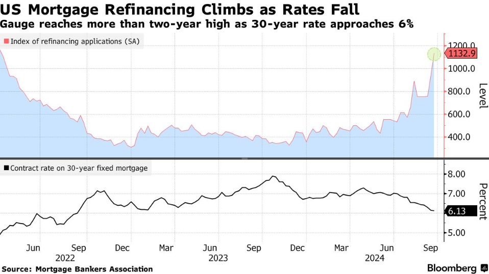 美国抵押贷款银行家协会的数据显示,截至9月20日的一周内,美国的抵押贷款再融资活动激增,再融资指数达到自4月以来的最高点。30年期固定抵押贷款利率下降了2个基点至6.13%,这是自2018-2019年以来的最长连续下跌周期。这一趋势推动了购房申请指数上涨1.4%,达到2月初以来的最高水平,且连续第五周上涨,表明房地产市场的需求正在增长并逐渐稳固。