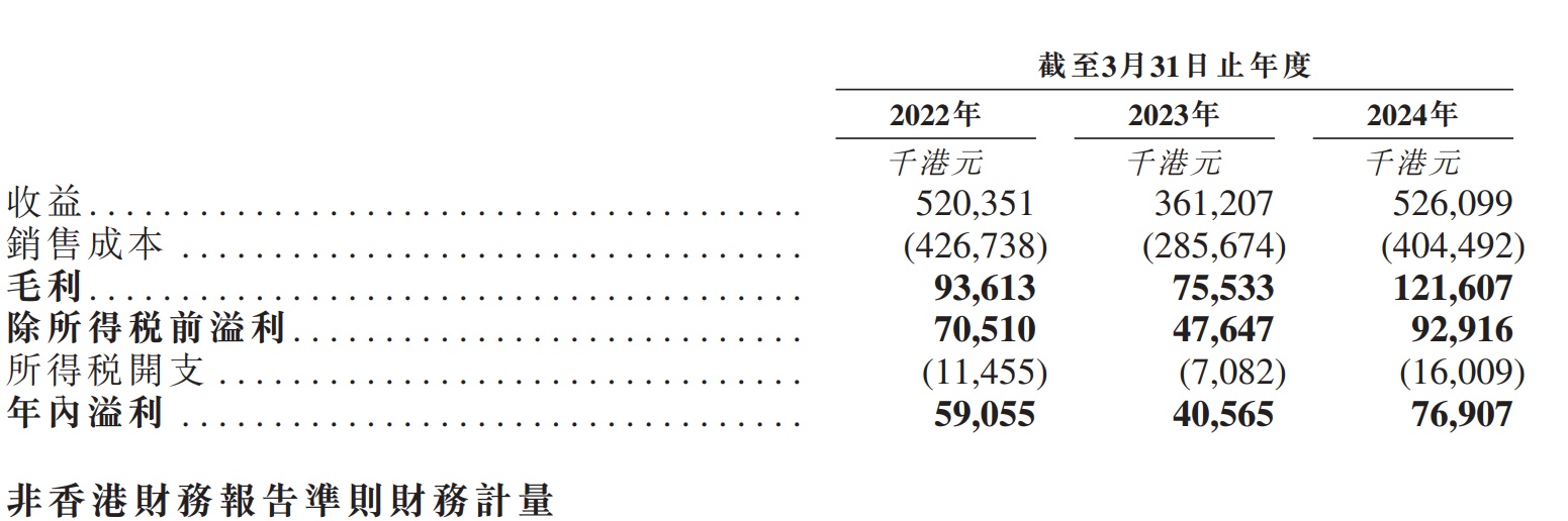 财务方面,于2022年截至3月31日止年度、2023年截至3月31日止年度、2024年截至3月31日止年度,公司的收入分别约为5.20亿港元、3.61亿港元、5.26亿港元;同期,公司的年内利润分别约为5905.5万港元、4056.5万港元、7690.7万港元。