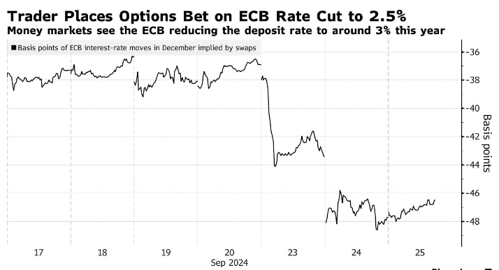 市场押注欧洲央行在10月会议上降息25个基点的可能性目前为60%,高于上周的20%。汇丰银行经济学家将他们的预测改为从下个月开始的每次会议降息25个基点,而施罗德银行表示,10月份降息是合理的。