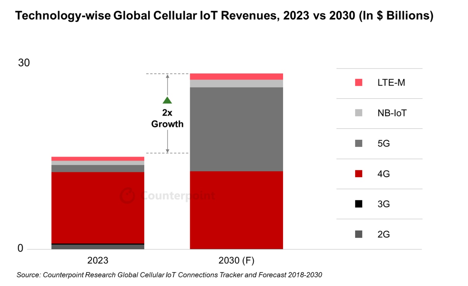 继续下降,但全球蜂窝物联网连接收入依然同比增长了17%,达到137亿美元。Counterpoint预计,到2030年,全球蜂窝物联网收入将超过260亿美元,随着平均每连接收入(ARPU)
