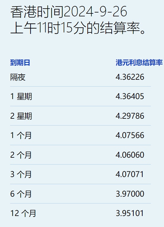 智通财经APP获悉,9月26日,港元三个月以下拆息全线上升,其中,隔夜息升近14基点至4.36226%,续创逾三周新高,与楼按相关的一个月拆息亦连升五天,报4.07566%,为8月19日以来最高。