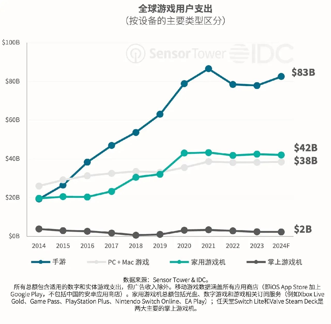 智通财经APP获悉,Sensor Tower、IDC和Mistplay三方合作对游戏行业进行了全面的分析。根据预测,2024年全球游戏用户支出规模为1650亿美元,其中有约50%来自移动游戏,表明该市场依然在游戏界占据主导地位,因为主机游戏、PC/Mac游戏和掌上游戏机的占比分别只在25%、24%和1%左右。用户支出方面,移动游戏在2023年的表现很不好,但目前已经出现了触底反弹的迹象。随着近期多款热门游戏的成功和新游戏的推出,移动游戏的用户支出在2024年有望实现6%的年同比增长,且后续还可能有更长的增长期。