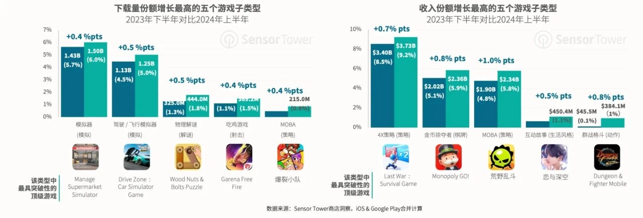 从下载量来看,份额前五的游戏中模拟类游戏的数值更高。收入榜单有些不同,4X策略、金币掠夺者和MOBA游戏要占据更多份额,引领这三种子类型的代表作分别是《Last War: Survival Game》、《MONOPOLY GO!》和《Brawl Stars》。