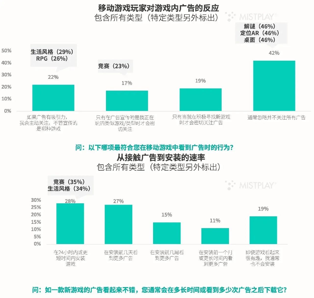 Mistplay的调研也反应出类似结果:玩家选择与广告互动和安装新游戏的主要原因有三个:奖励和激励(42%)、游戏类型相关度(40%)和吸引人的游戏玩法(38%)。然而,也有近50%的玩家将“广告过多”视为不玩一款游戏的主要原因,其中14%的玩家会在看到广告并安装新游戏后放弃现有游戏。为提高广告参与度和减少玩家流失,建议在广告中加入特别激励和其他相关内容,这样有助于提升转化率和长期参与度,由此提高玩家体验全过程的价值。