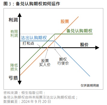 据恒指公司介绍,备兑认购期权策略是指,在买入相关资产的同时,沽出所买入相关资产的认购期权(图3)。简单来说,认购期权赋予买方权利,可于到期日以预定的行使价购买相关资产。所以,当投资者采取备兑认购期权策略,沽出认购期权以从期权买方换取期权金时,相当于将该资产的上升空间(当资产价格升至期权行使价时须将该资产卖予期权买方)转化为期权金所带来的收益,而期权金则可在市场下跌时作对冲,从而降低组合波动性。