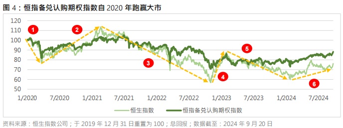 恒指备兑认购期权指数与恒生国指备兑认购期权指数皆于2019年6月推出,分别反映备兑认购期权策略(平价期权行使价)应用于恒指和国指的投资组合上之整体表现,另外,两项指数同样具备5%价外期权行使价的版本。由于期权金带来额外收益,备兑认购期权策略在大市向下或横行时表现较佳。不过,当大市上扬时,上升空间却会被期权行使价限制,因为一旦触及行使价,备兑期权策略下的资产便会售予认购期权的买方。