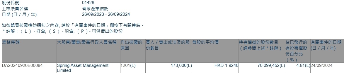 智通财经APP获悉,香港联交所最新资料显示,9月24日,Spring Asset Management Limited减持春泉产业信托(01426)17.3万股,每股作价1.924港元,总金额约为33.29万港元。减持后最新持股数目约为7009.95万股,持股比例为4.81%。