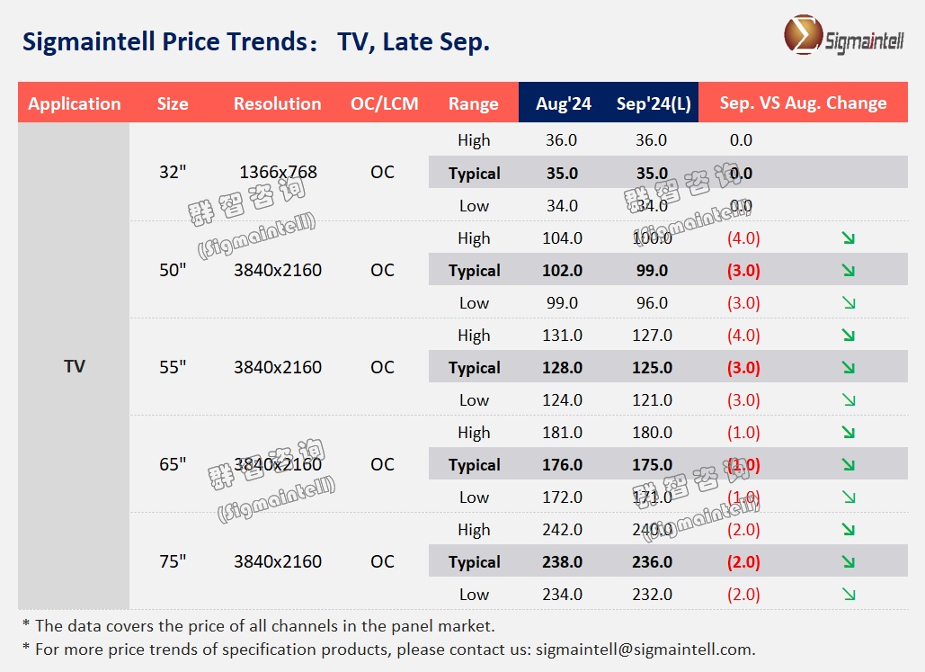 智通财经APP获悉,群智咨询(Sigmaintell)预测数据显示,三季度末中国市场65"+大尺寸面板备货需求恢复,面板供应略有恢复但整体处于控产状态,预计九月LCD TV面板价格维持下降趋势,但降幅显著收窄。
