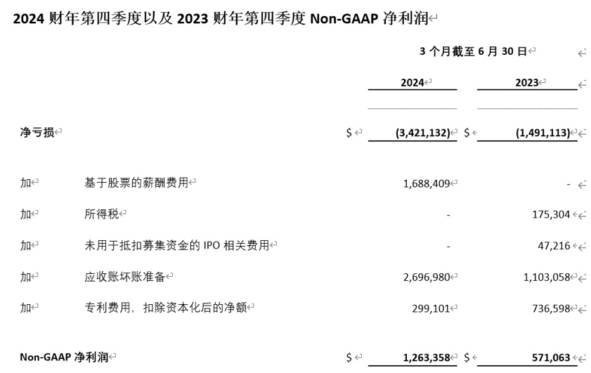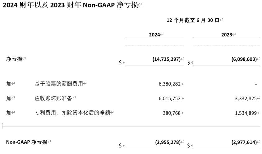 净亏损在截至2024年6月30日财年为1480万美元,或每股净亏损0.27美元,而同期2023财年的净亏损为600万美元,或每股净亏损0.12美元