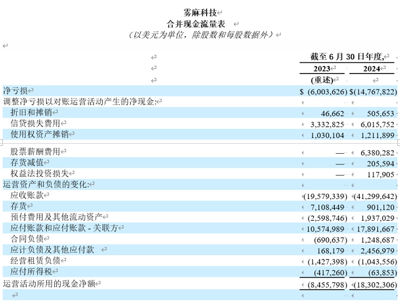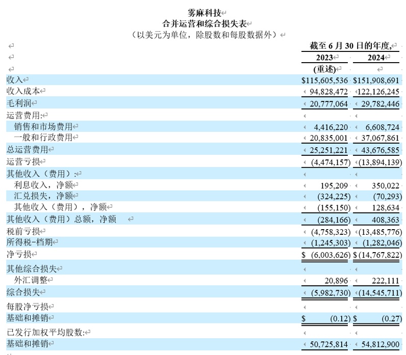 截至2024年6月30日,雾麻科技的现金及现金等价物约为3510万美元,,营运资本为1660万美元。