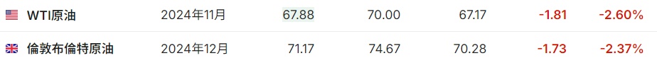 3. 截至发稿,WTI原油跌2.60%,报67.88美元/桶。布伦特原油跌2.37%,报71.17美元/桶。