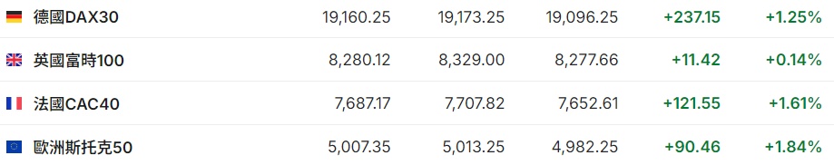 2. 截至发稿,德国DAX指数涨1.25%,英国富时100指数涨0.14%,法国CAC40指数涨1.61%,欧洲斯托克50指数涨1.84%。