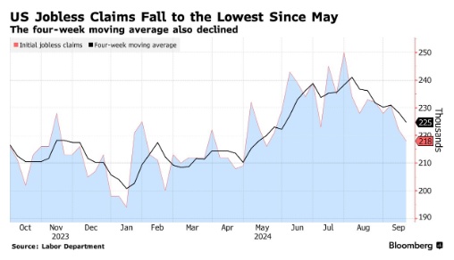 根据美国劳工部周四公布的数据,截至9月21日当周,初请失业金人数减少4000人,降至21.8万人,经济学家的平均预期为22.3万人。