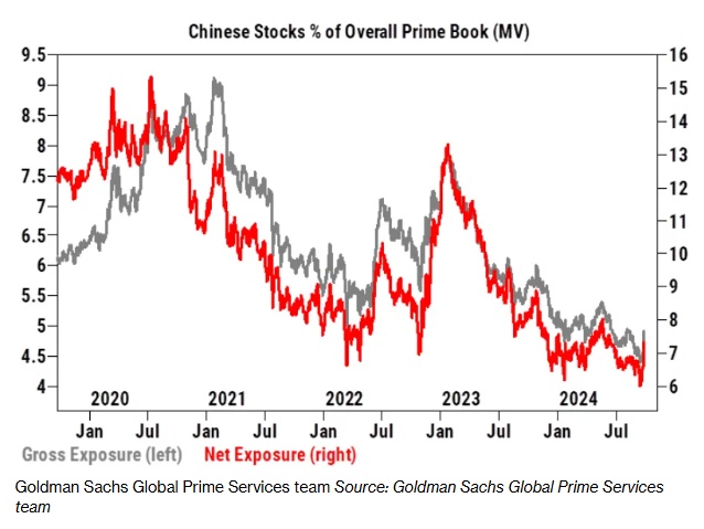 高盛指出,在最近的上涨之前,对冲基金对中国股票的投资比例不到7%,大约是五年来的最低水平。但本周早些时候,它们改变了方向并纷纷涌入中国股票市场,周二的单日净买入量创下了自2021年3月以来的最大单日净买入量,也是过去十年来的第二大单日净买入量。