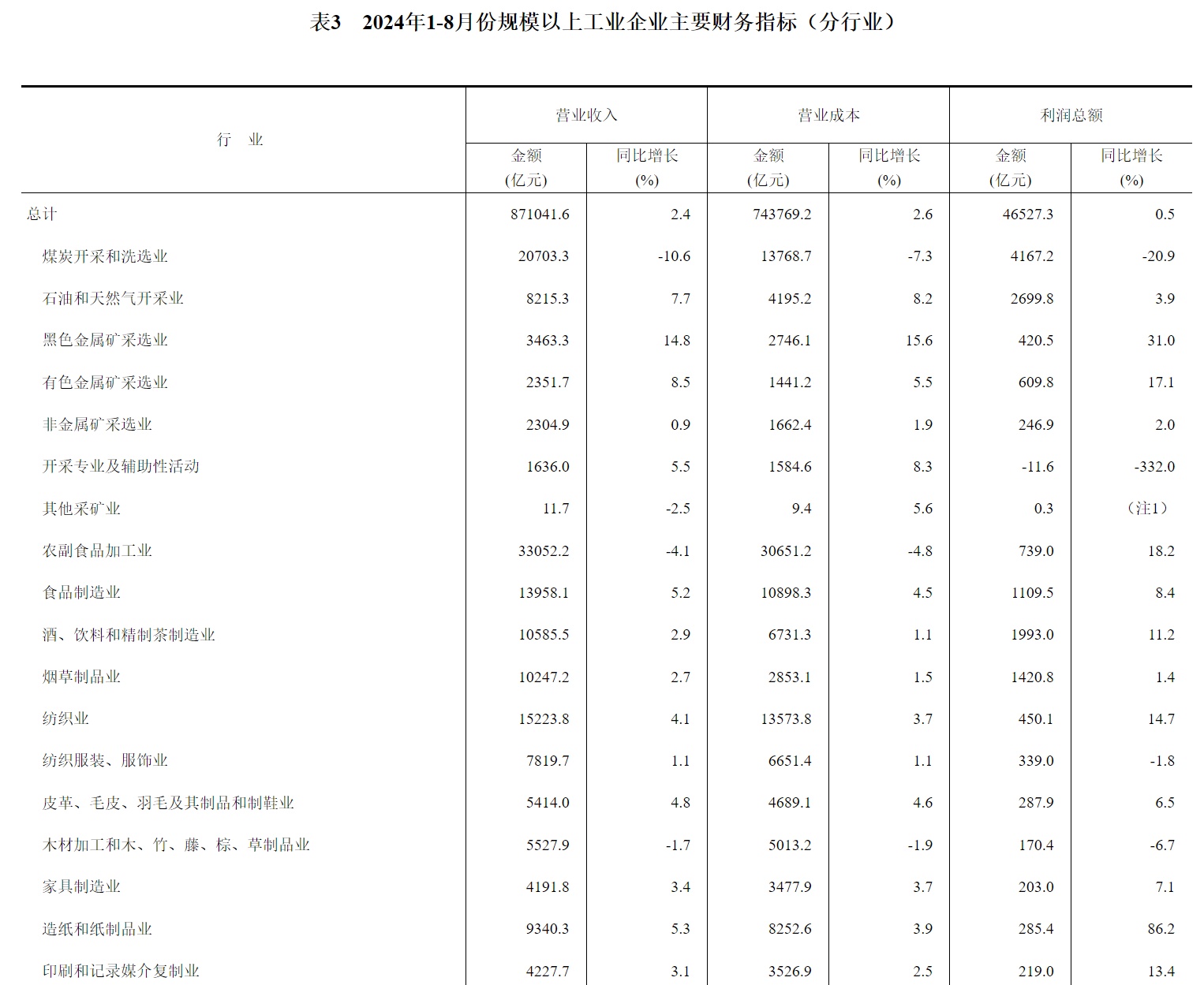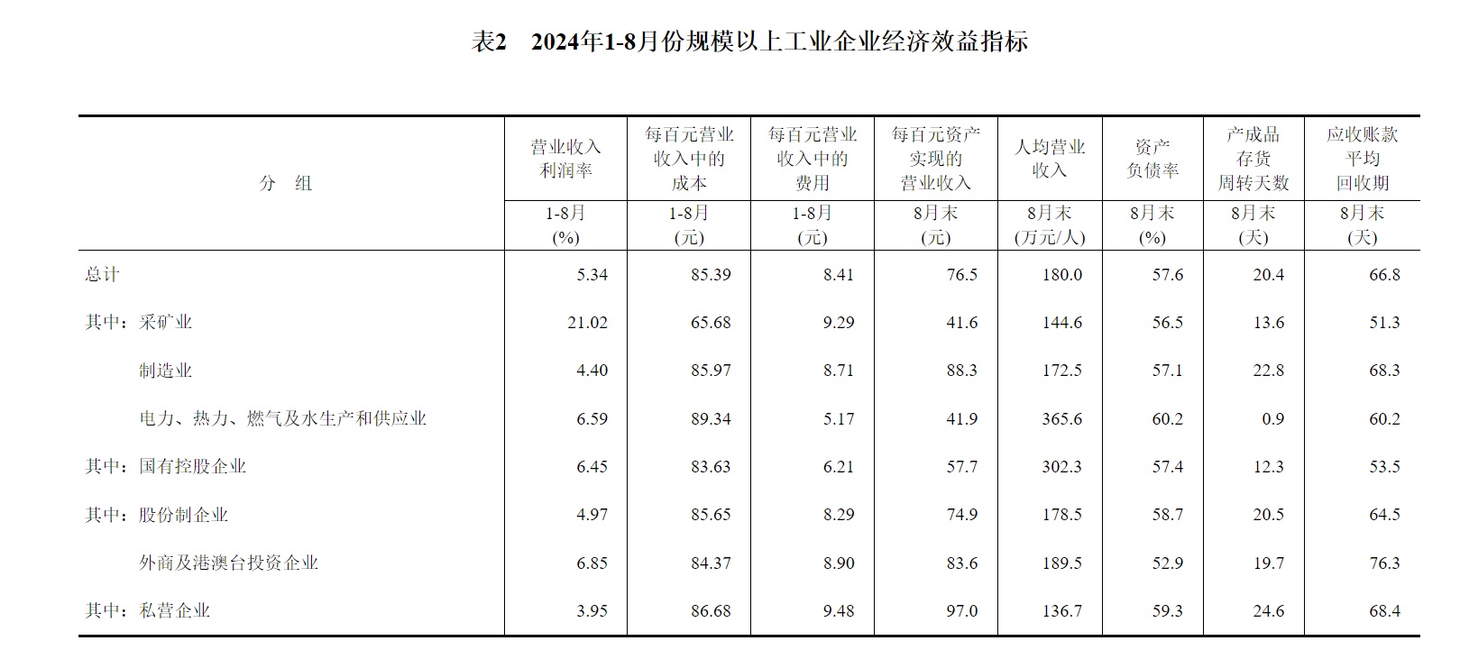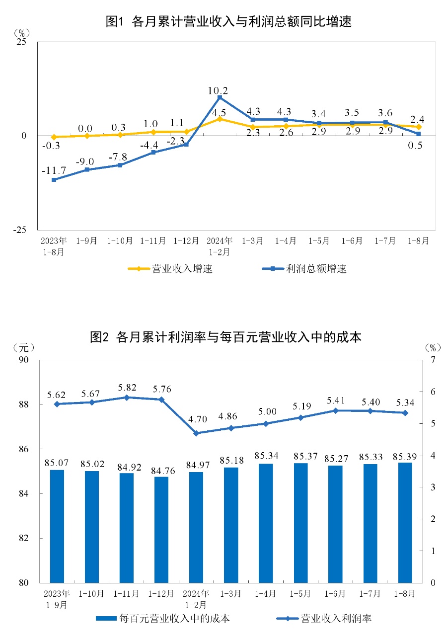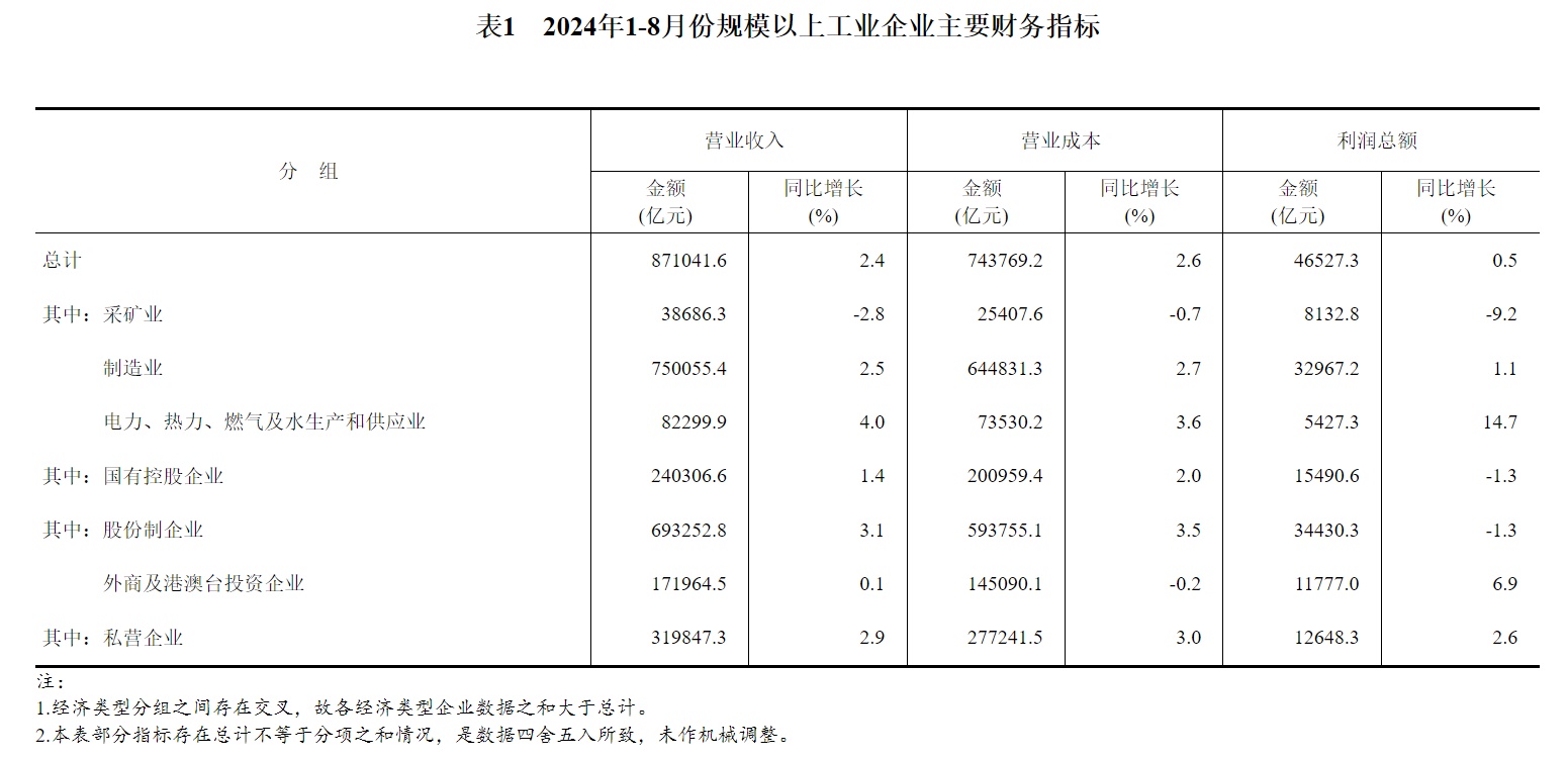 2024年1—8月份全国规模以上工业企业利润增长0.5%