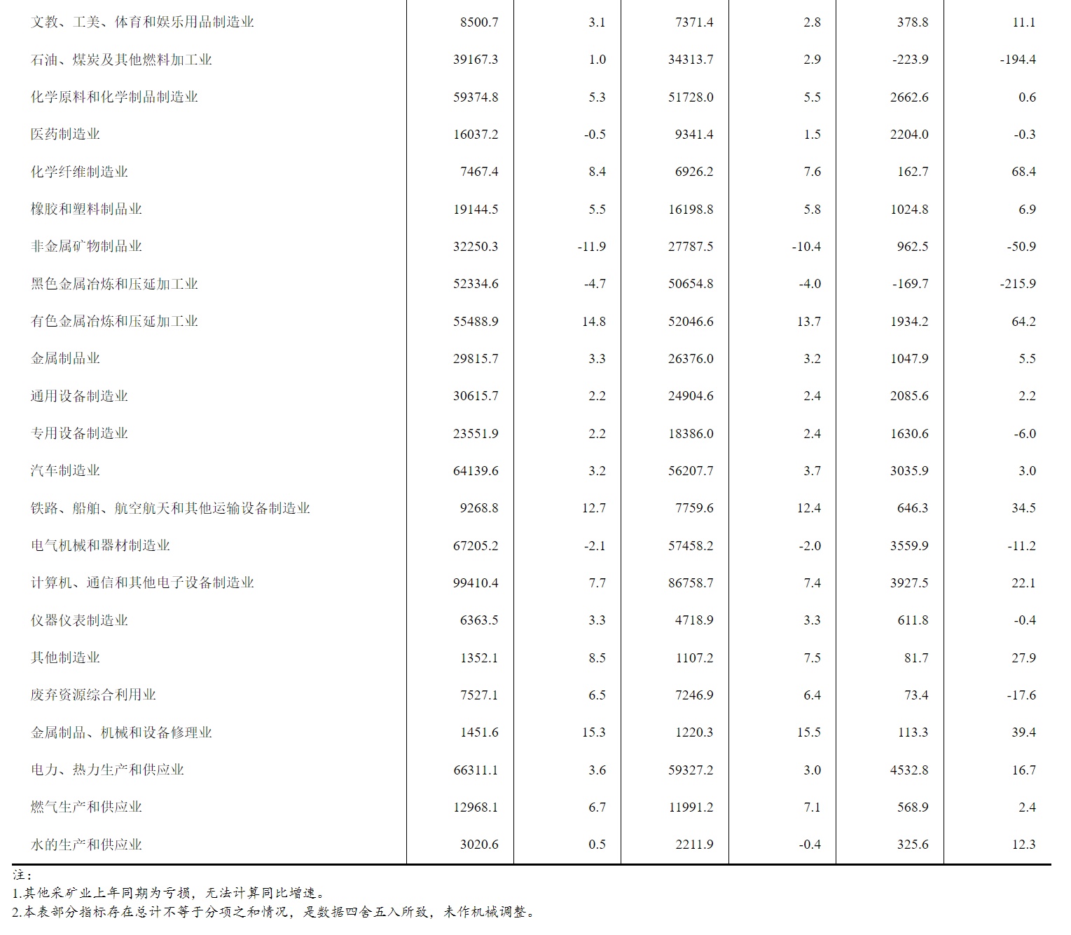 1—8月份,主要行业利润情况如下:有色金属冶炼和压延加工业利润同比增长64.2%,计算机、通信和其他电子设备制造业增长22.1%,农副食品加工业增长18.2%,电力、热力生产和供应业增长16.7%,纺织业增长14.7%,石油和天然气开采业增长3.9%,汽车制造业增长3.0%,通用设备制造业增长2.2%,化学原料和化学制品制造业增长0.6%,专用设备制造业下降6.0%,电气机械和器材制造业下降11.2%,煤炭开采和洗选业下降20.9%,非金属矿物制品业下降50.9%,石油煤炭及其他燃料加工业、黑色金属冶炼和压延加工业同比由盈转亏。