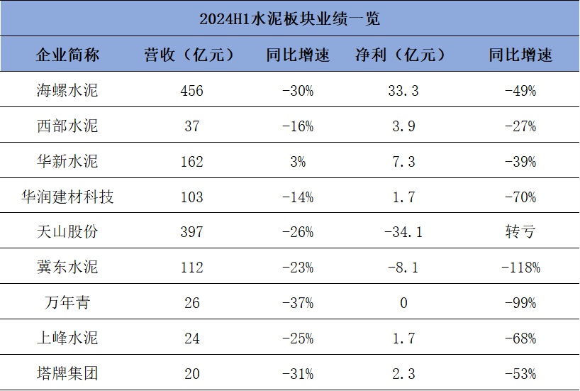 2024年上半年,水泥市场需求延续弱势,行业景气度持续底部区域徘徊,整体承压运行的态势也反映到了各家上市公司的业绩中。根据中国建筑材料联合会数据,2024年上半年水泥行业利润总额为-11.5亿元,企业亏损面超过50%。