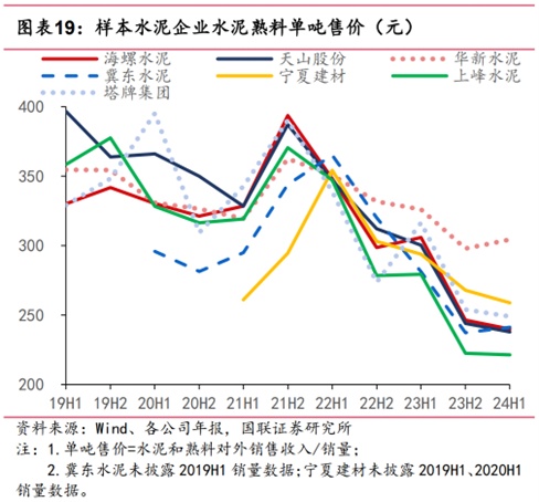 从水泥单吨售价来看,上半年大部分水泥企业单吨售价下降,其中华新水泥、冀东水泥的单吨均价分别环比增加6元和4元,主要原因分别为华新水泥海外售价提高,及二季度东北错峰力度加大推动水泥价格率先回暖。