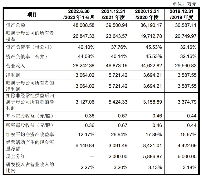 财务方面,2019年度、2020年度、2021年度以及2022年1-6月,百胜动力实现营收分别约为3亿、3.46亿、4.69亿以及2.82亿元人民币;同期净利润分别为3587.55万、3694.21万、5721.42万以及3064.02万元人民币。