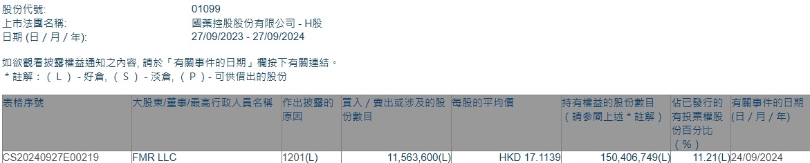 智通财经APP获悉,香港联交所最新资料显示,9月24日,FMR LLC减持国药控股(01099)1156.36万股,每股作价17.1139港元,总金额约为1.98亿港元。减持后最新持股数目约为1.50亿股,持股比例为11.21%。