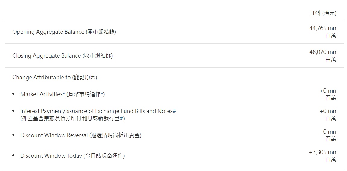香港金管局通过贴现窗口向银行投放33.1亿港元流动性