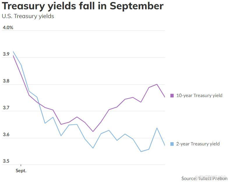 根据道琼斯市场数据,两年期美国国债收益率周五下跌至3.562%,这是自2020年12月以来最长的连续四周下跌。十年期美债收益率也下滑至3.751%。整个9月,美国国债收益率普遍下跌,投资者预期美联储将在本月开始降息。