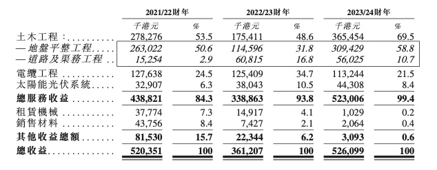 招股书显示,荣利营造为从事土木及机电工程以及可再生能源工程的具规模香港承建商。其土木工程专注于地盘平整工程以及道路及渠务工程,机电工程则专注于电缆挖沟、铺设及接驳工程。根据行业报告,荣利营造是2023年香港最大的电缆及民用管道安装分包商,以公司2023/24财年的收益计,市场份额约为13.6%。自2019年起,公司亦于可再生能源分部下进行太阳能光伏系统的设计、安装及维护工程。就可再生能源工程而言,公司专注于太阳能光伏工程。其次,在公司参与的少数项目中,会临时向承建商及分包商租赁机械及买卖建筑材料。