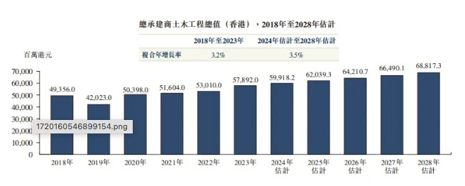根据政府统计处的数据,香港总承建商进行的土木工程总值由2019年至2023年的复合年增长率约为3.2%。未来数年,古洞北及粉岭北新发展区、明日大屿愿景项下的交椅洲人工岛、东涌新市镇扩展等项目相继落成及开展,将维持土木工程的需求,预计香港土木工程总值将于2024年至2028年期间以3.5%的复合年增长率增长。