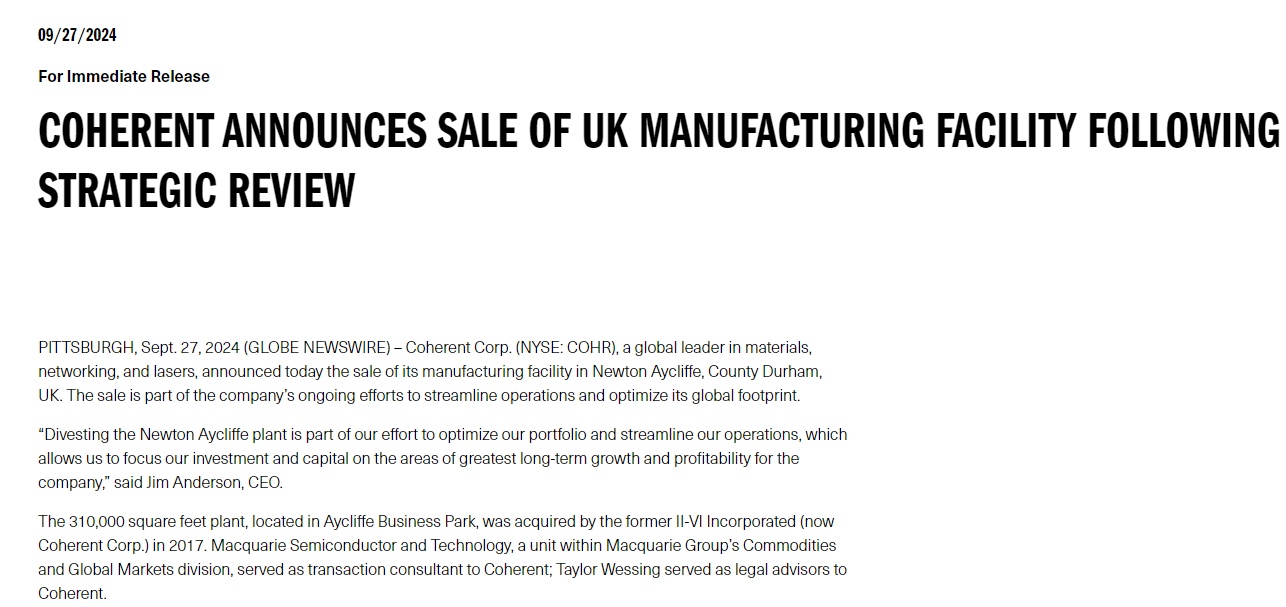 Coherent首席执行官JimAnderson表示,剥离NewtonAycliffe工厂是公司优化投资组合和简化运营努力的一部分,这使其能够将投资和资本集中在公司最长期增长和盈利能力的领域。