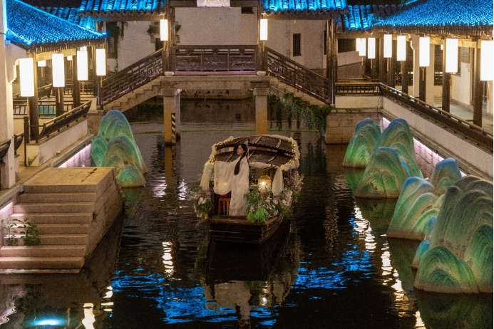 国庆期间,所有进入青靛甪直景区的游客除了参与《梦幻新诛仙》游戏角色相关的互动外,还可以参加有游戏主角团助阵的“奇幻市集”获赠小礼物,并可观看景区的各种主题演艺节目。此外,还有“梦幻新诛仙主题花船”、“花神江南行”、“江南幻境游”COSER主题活动等沉浸式趣味活动可供游客体验及参与互动。这些活动通过将游戏元素与景区江南文化元素的融合,打造出了丰富多彩的夜游体验新场景。