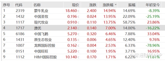 早盘港股乳业指数(887661.WI)高开超7%,盘中一路走高,截止收盘港股乳业指数大涨8.02%。个股方面,蒙牛乳业(02319)涨14.94%,收18.46港元;中国圣牧(01432)涨13.95%,收0.196港元;现代木业涨13.75%,收0.91%港元;澳优涨7%,收2.14港元。