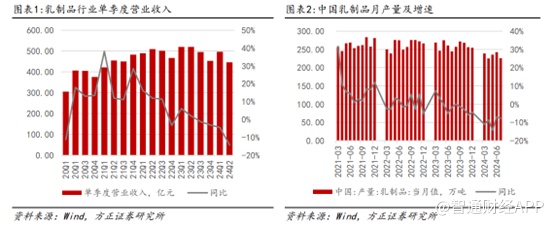 原奶供需矛盾是今年乳业面临的主要挑战,原奶供大于求导致上游牧场经营压力较大,上游加速淘汰产能,2024年4-6月我国奶牛存栏数量持续环比回落,截止到2024年6月末,我国奶牛存栏量630万头,较2024Q1末减少16万头。2024年7月乳制品产量同比下滑6%,同比降幅较2024年6月扩大,板块供需错位问题深化有望继续加速上游去化。