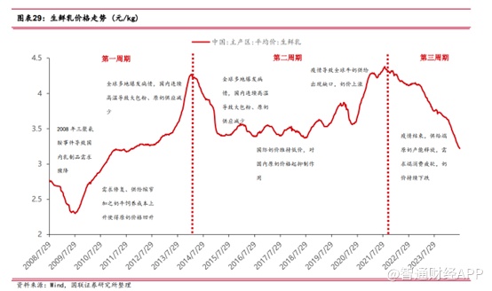 据智通财经APP了解,农业部自2008年以来对于国内主产区生鲜乳平均价的统计数据,并将2008年至今的时间划分为三轮周期,分别为2008-2013年底、2014-2021年中、2021-至今。三轮周期内原奶价格波动较大,价格高低点之间相差接近一倍,供需关系依然是导致周期的核心原因。整个过程中原奶产业同步正在不断发展,而不同周期内价格的重要影响因素也在变化。