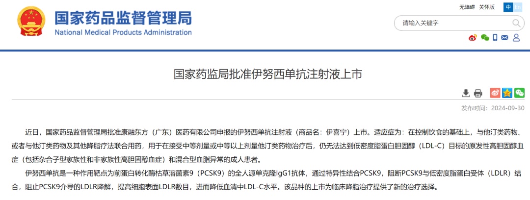 智通财经APP获悉,9月30日,中国国家药监局(NMPA)官网宣布康方生物(09926)1类新药伊努西单抗注射液(AK102)上市申请已正式获批,适应症为:在控制饮食的基础上,与他汀类药物、或者与他汀类药物及其他降脂疗法联合用药,用于在接受中等剂量或中等以上剂量他汀类药物治疗后,仍无法达到低密度脂蛋白胆固醇(LDL-C)目标的原发性高胆固醇血症(包括杂合子型家族性和非家族性高胆固醇血症)和混合型血脂异常的成人患者。