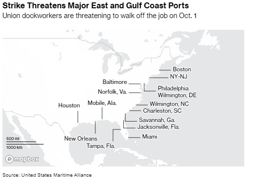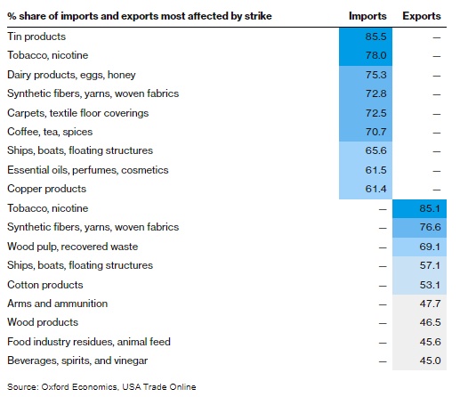 东海岸和墨西哥湾沿岸港口是处理关键铜、棉花、锡和木材等原材料和制造业贱金属的主要港口。汽车行业也可能受到影响,尽管只有部分汽车和零部件是通过受威胁的港口进口的。
