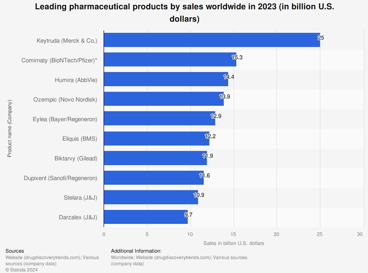 的Dupixent。Humira面临生物仿制药的竞争,而Comirnaty则因新冠疫情影响减弱导致需求下降。默沙东(MRK.US)的Keytruda继续领跑,预计销售额将达到272亿美元。