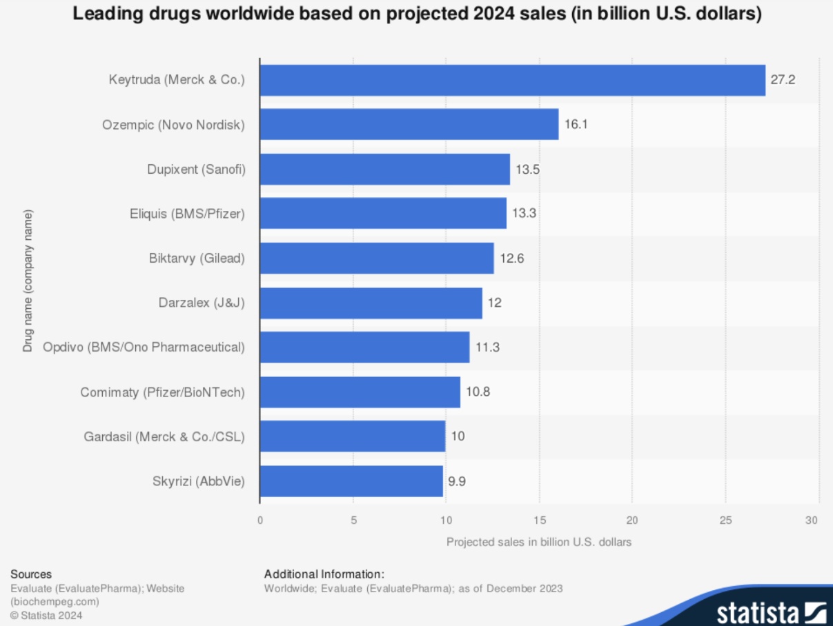 默沙东的肿瘤药物Keytruda(pembrolizumab)预计将在2024年继续成为最畅销的药物,预计销售额为272亿美元,比2023年的250亿美元有所增长。这表明癌症治疗对制药公司的重要性日益增加,2023年全球肿瘤治疗支出预计将达到2180亿美元,是2017年1020亿美元的两倍多。
