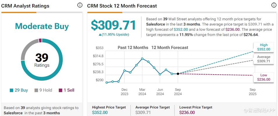 总体而言,华尔街分析师予赛富时“适度买入”评级,平均目标价为309.71美元,较当前水平高出12%。