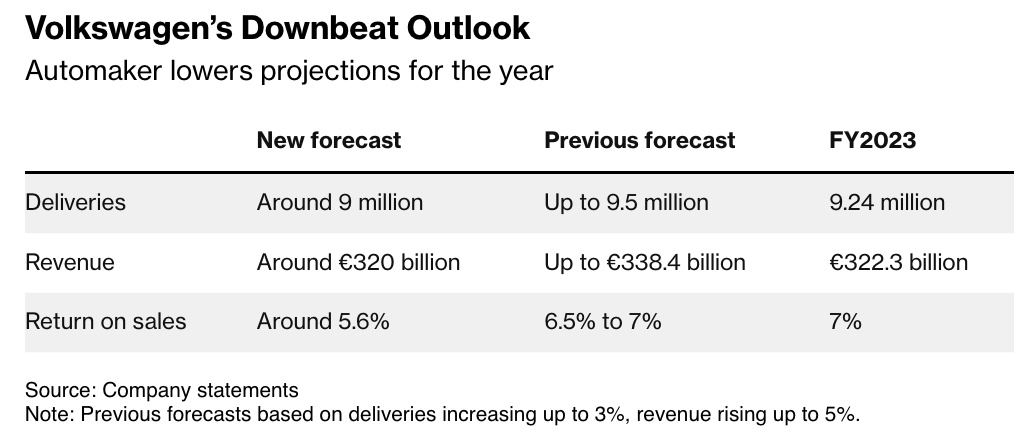 由于汽车需求疲弱,大众汽车在上周五下调了其营收、利润和现金流预期。该公司目前预计,2024年营收将从2023年的3220亿欧元下降0.7%至3200亿欧元,而此前的预期为增长至多5%;预计2024年利润率将降至5.6%,而此前的预期为6.5%-7%。