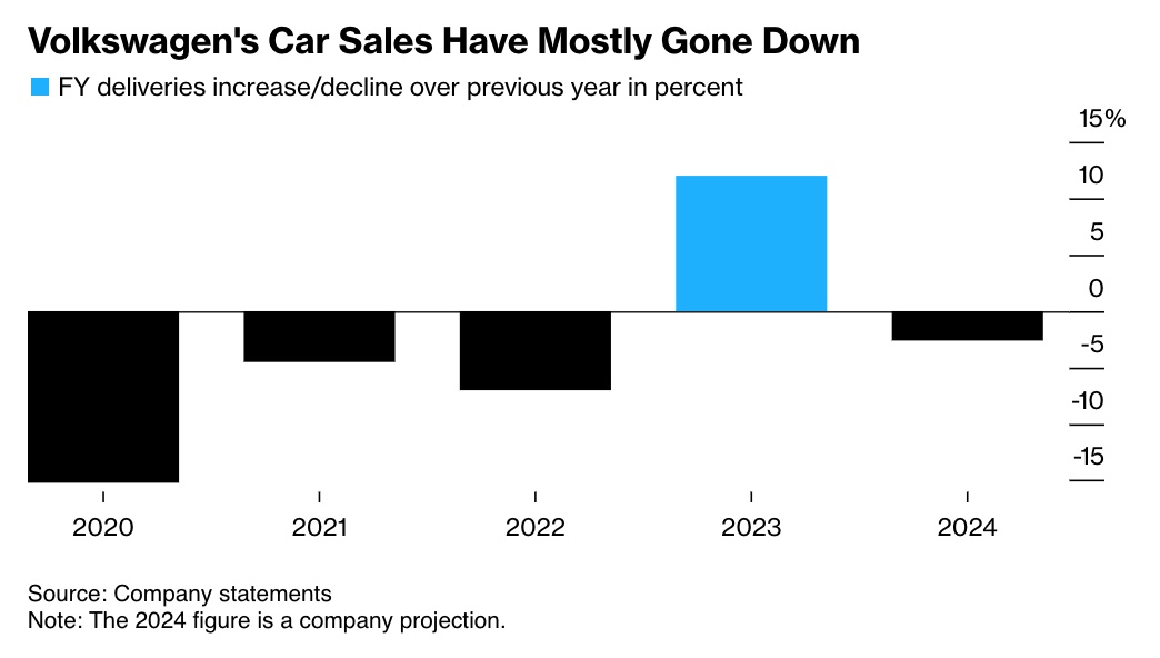此外,大众汽车还预计,2024年汽车部门净现金流约为20亿欧元,低于此前预期的45亿欧元。该公司还将2024年的全球汽车交付量预期下调至约900万辆,低于此前预期的较2023年增长3%的目标(2023年大众汽车总交付924万辆),这将是该公司五年来第四次出现年度交付量下滑。