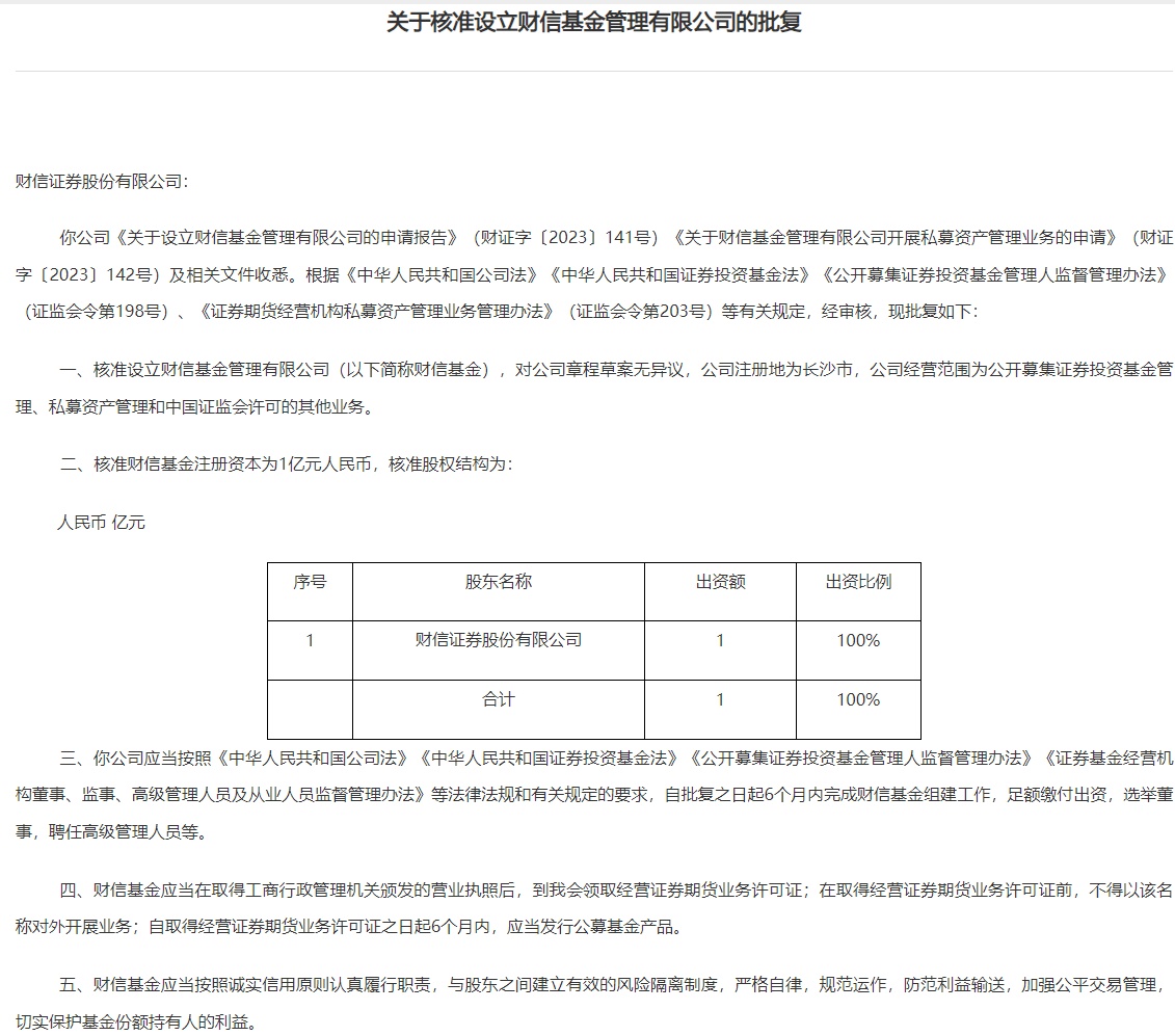 智通财经APP获悉,9月30日,中国证监会发布公告称,核准设立财信基金管理有限公司,对公司章程草案无异议,公司注册地为长沙市,公司经营范围为公开募集证券投资基金管理、私募资产管理和中国证监会许可的其他业务。