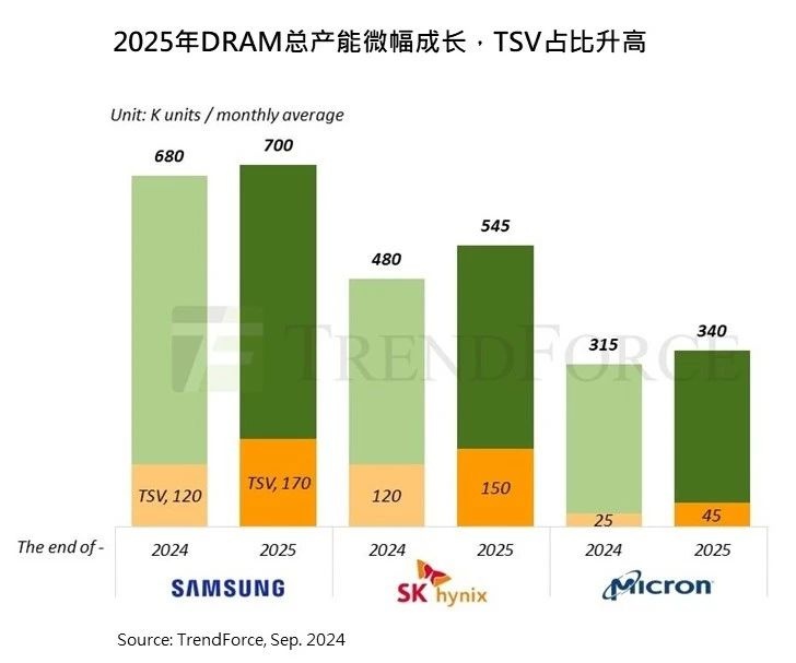 市场传出因部分DRAM供应商积极增加硅穿孔(Through-Silicon Via, TSV)制程产能,将造成2025年出现供过于求与价格下滑的可能。根据两家韩国DRAM厂商目前的TSV产能提升计划,Samsung将从2024年底的单月120K至2025年底增加为单月170K,提升幅度超过40%,而SK hynix在同期的月产能提升比例预估为25%。但由于厂商产品尚未完全通过验证,产能提升规划是否能落实有待观察。