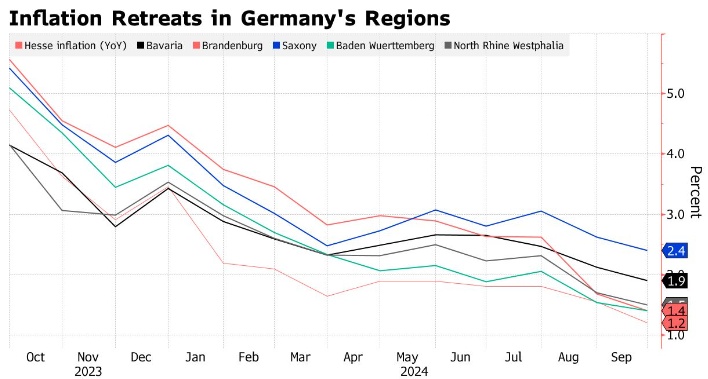 智通财经获悉,9月份,德国6个州的通胀率下降,表明将于今日晚些时候公布的整体数据将放缓,这将进一步推动欧洲央行在10月份降息的呼声。周一公布的初步数据显示,德国人口最多的州北莱茵-威斯特伐利亚州的CPI同比涨幅从8月份的1.7%降至1.5%。在黑森州,CPI同比增速则从1.5%降至1.2%。