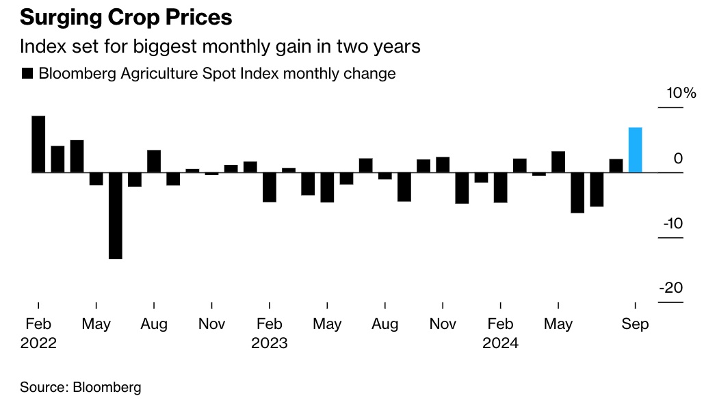 智通财经APP获悉,从亚洲到美洲的干旱、暴雨和火灾加剧了人们对农作物收成的担忧,推高了主食价格,并最终可能导致食品杂货价格上涨。包括九种主要农产品在内的Bloomberg农业现货指数有望在9月实现约7%的月度涨幅,这是自2022年初俄乌冲突爆发以来的最大单月涨幅。